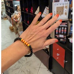 Polsera original amb boles negres i peces de Lego reciclat, amb els colors vermell i groc!